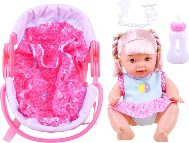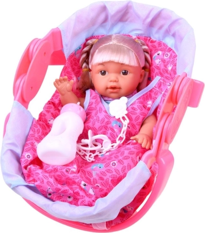 De set bevat een schattige pop, een flesje, een speen aan een kettinkje en een draagmand.