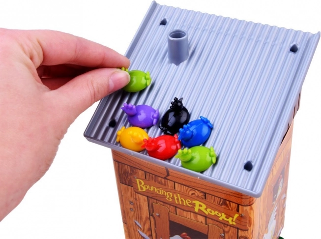 Zet het kippenhok in het midden van de tafel, verdeel de kuikentjes en gaan! Spelers gooien met een speciale kleurendobbelsteen en leggen op basis van de gegooide kleur het bijpassende kuikentje op het dak. Eenvoudige regels, maar een flinke portie spanning – het kippenhok kan op elk moment opspringen en de speler die aan de beurt is neemt dan enkele kuikentjes terug. Degene die als eerste al zijn kuikentjes kwijt is, wint.