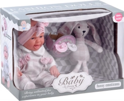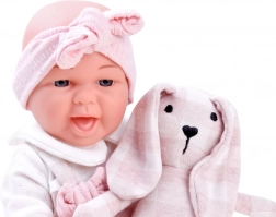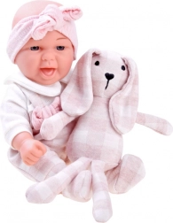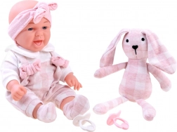 Deze schattige baby-pop is gekleed in een wit-roze outfit met een zachte haarband, een topje gecombineerd met geruite korte broek en witte sokjes. In de set vind je ook een zacht pluchen konijntje met geborduurde oogjes en neusje en twee fopspenen (wit en roze). Alles is afgestemd in een zachte roze-witte kleurstelling die lief en fris oogt.