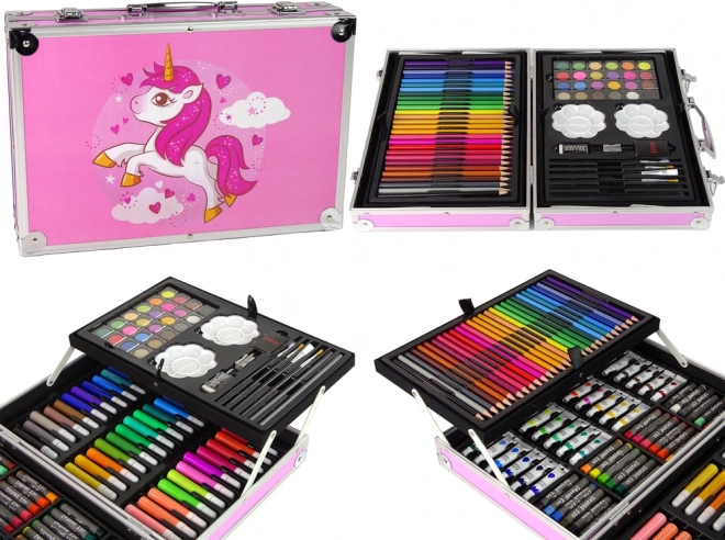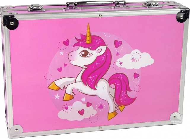 Het roze metalen koffertje met een schattige eenhoorn zal jonge kunstenaars betoveren en motiveren om nog meer te creëren.