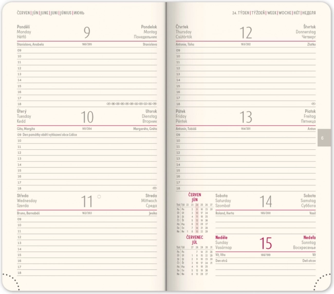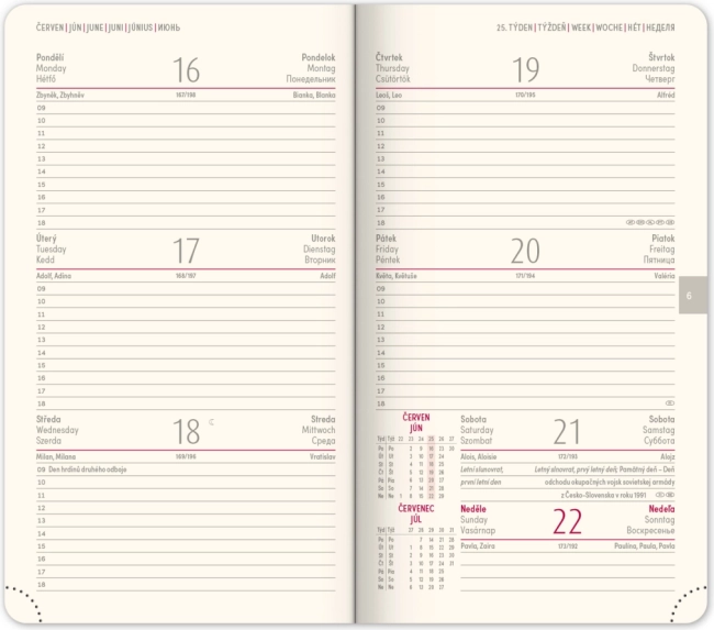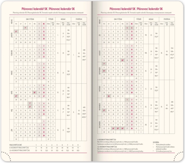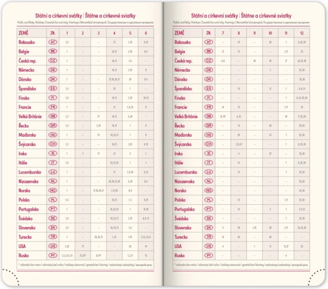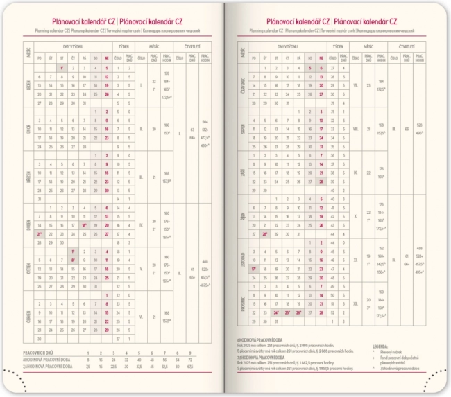 - Werkplanner en een overzicht van feestdagen in Tsjechië en Slowakije, inclusief internationale feestdagen.