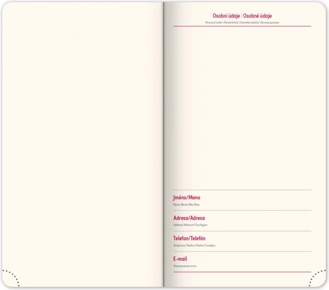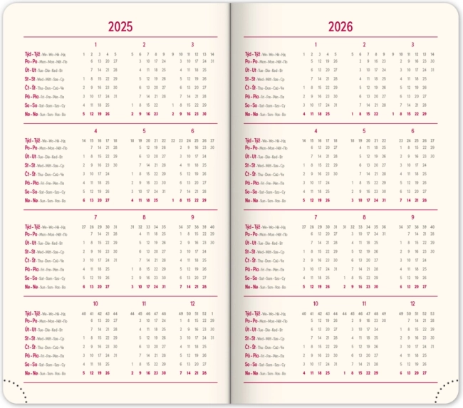 De Notique Diamante 2025 zakagenda valt op door het compacte formaat van 9 × 15,5 cm en het elegante rode design. Hij biedt een weekoverzicht met een Tsjechisch‑Slowaakse kalender en aanvullende Engels, Duits, Hongaars en Russisch. Dankzij de overzichtelijke planners en praktische details houdt u uw taken en afspraken altijd onder controle.