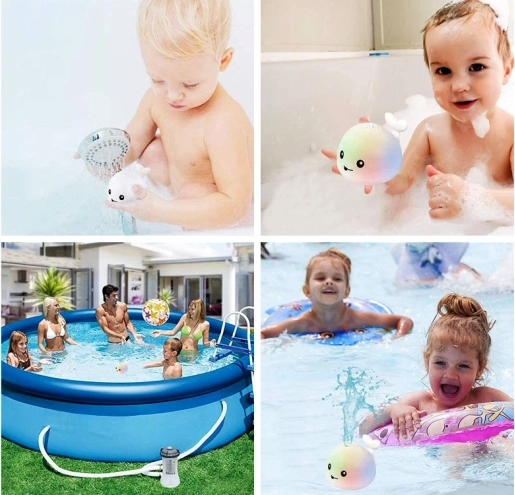 Na onderdompeling start de walvis automatisch en creëert een mini-waterstraal met wisselende kleuren – meteen boeiend en leuk bij elk badmoment.