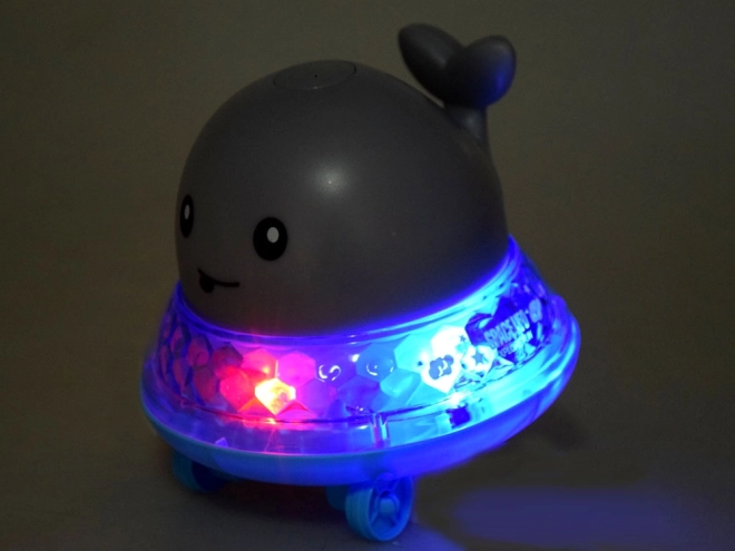 Buiten het water zet je de walvis op het platform, schakel je on/off om en kijk je hoe hij rijdt op het ritme van vrolijke muziek met lichteffecten.