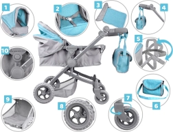 De praktische uitrusting omvat een inklapbare kap, een verstelbare en zacht gevoerde duwbeugel, veiligheidsriemen voor de pop, een ruime ondermand en een bijpassend afneembaar tasje voor essentials. De massieve wielen van EVA-materiaal zijn stil en onderhoudsarm.
