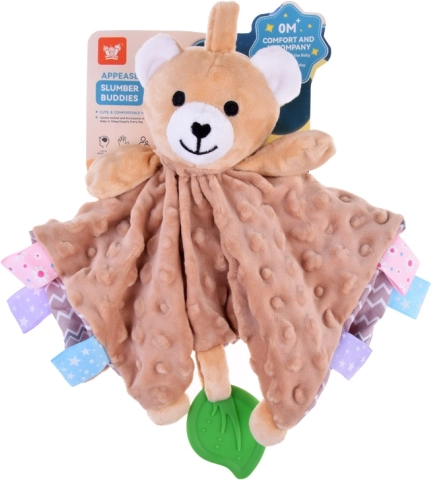Dit schattige pluchen knuffeldoekje in de vorm van een beertje biedt vanaf de eerste levensdagen zachte troost en zintuiglijke prikkels. Het heeft een superzachte minky-stof met 3D‑stipjes, gekleurde labeltjes om mee te spelen, een siliconen bijtring ter verlichting van het tandvlees en krinkel- en piepelementen die nieuwsgierigheid en zintuiglijke ontwikkeling stimuleren.