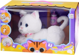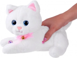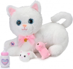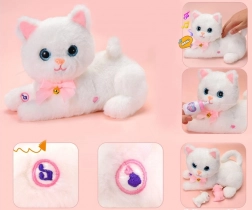 De interactieve witte kat is de perfecte vriend voor jonge dierenvrienden. Ze heeft grote blauwe ogen, een roze strik met belletje en een zachte pluche vacht die uitnodigt om te knuffelen. In haar buik verbergt ze twee kleine kittens en in de set zit ook een roze flesje om het voeden na te spelen.