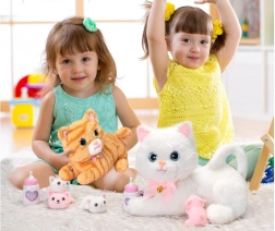 Een schattige interactieve kat met twee kittens en een flesje zorgt voor uren speelplezier en rustgevend knuffelen. Dankzij functies zoals opnemen en afspelen, miauwen en spinnen, melodieën en liedjes en reacties op aaien en voeden leren kinderen zorgen en hun fantasie ontwikkelen. De kittens zitten verstopt in de buik van de mama en de knuffel is gemaakt van zachte, aangename pluche.