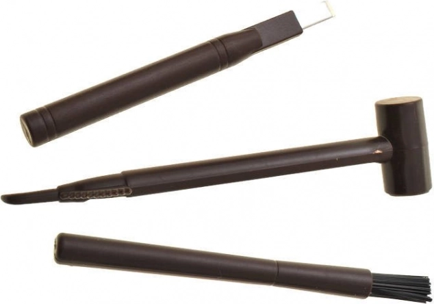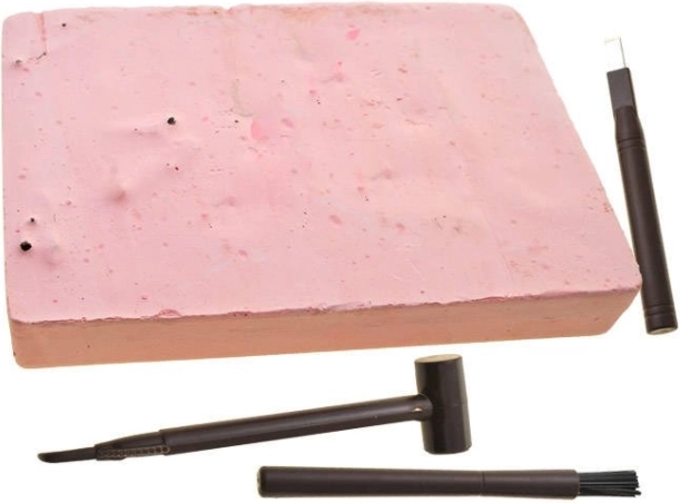 - Complete uitrusting: blok, hamertje met schraper, beiteltje en kwast