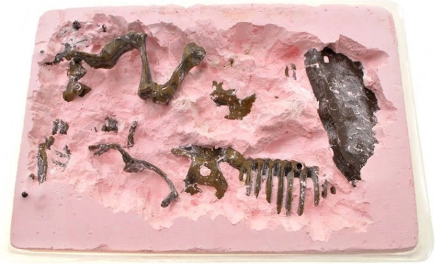 - Gips opgravingsblok, kwast, beiteltje, hamertje met schraper, skeletdelen, voetstuk