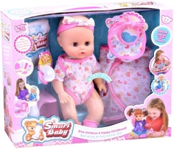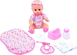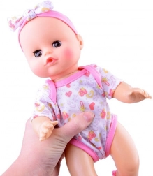 De pop draagt een comfortabel rompertje met een zachte haarband en sokjes. In de doos vind je ook een potje, luier, slabbetje, flesje en speen, zodat niets een complete verzorging in de weg staat. De hoogte van ca. 30 cm is ideaal voor kinderhandjes en makkelijk mee te nemen.
