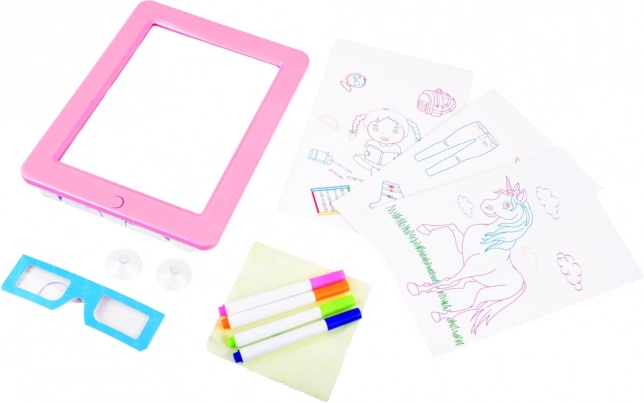 Deze lichttablett is ideaal voor kleine kunstenaars die graag tekenen en nieuwe effecten ontdekken. Tekeningen kunnen vrij worden gemaakt of volgens de meegeleverde kaartjes. Plaats ze vervolgens in het frame met LED-achtergrondverlichting en zet de 3D-bril op voor een indrukwekkend ruimtelijk effect.