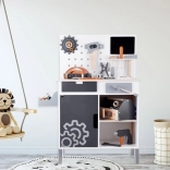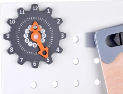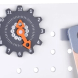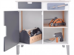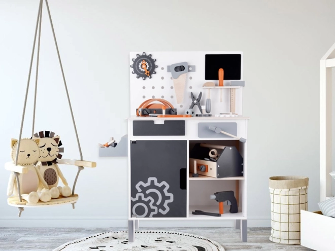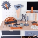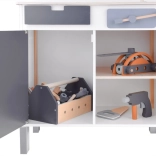 De tafel is voorzien van opbergruimtes en een pegboard die kinderen leren hun gereedschappen en accessoires effectief te organiseren.