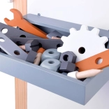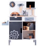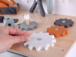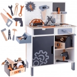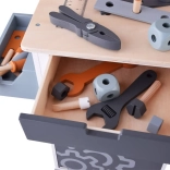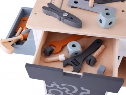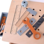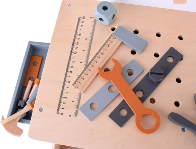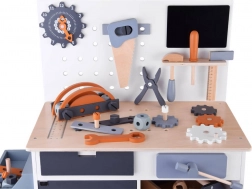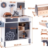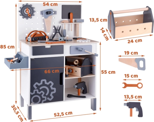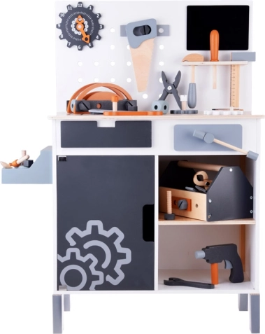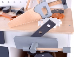 De houten werktafel voor kinderen is de ideale speelgoedset voor het ontwikkelen van creativiteit en fijne motoriek. Dankzij de brede selectie aan gereedschappen zoals zaag, hamer, schroevendraaier en veel meer, kunnen kinderen zich onderdompelen in de wereld van doe-het-zelf spellen en simulatie van een echte werkomgeving.