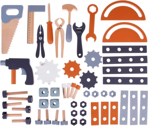 De set bevat een breed scala aan gereedschappen zoals een zaag, boor, hamer, sleutels, schroevendraaiers en meer - ideaal voor het ontwikkelen van praktische vaardigheden.
