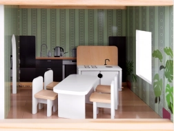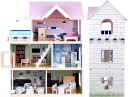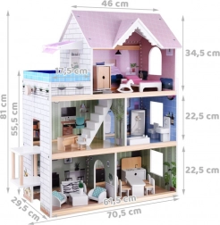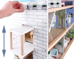 Dit prachtige poppenhuis heeft een realistisch en stijlvol ontwerp dat elk kind zal betoveren. Het huis beschikt over drie verdiepingen vol met gedetailleerde kamers: slaapkamer, woonkamer, badkamer, keuken en eetkamer. Een beweegbare lift en een stijlvol zwembad op het terras verhogen de aantrekkingskracht en bieden ruimte voor creatief spel.