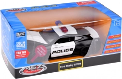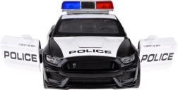 Verwen kleine én grote autofans met het model van de politieauto Ford Mustang Shelby GT350. De metalen carrosserie in zwart‑wit met de opdruk POLICE, functionele te openen deuren en knipperende zwaailampen geven de auto een authentieke uitstraling. Bij het indrukken of openen van de deuren worden lichten en sirene geactiveerd, waardoor het speelplezier nog realistischer wordt.