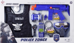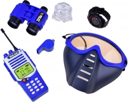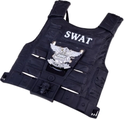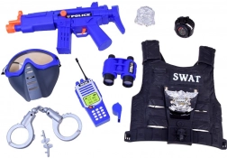 - SWAT-vest, speelgoedwapen, walkietalkie (3× AG13 inbegrepen), verrekijker, fluitje, horloge, beschermend masker/bril, handboeien, badge