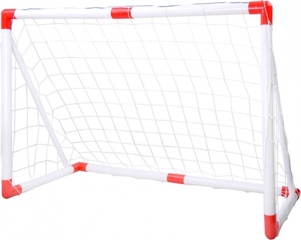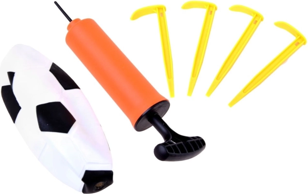 De verpakking bevat een doel met net, bal, pompje en 4 grondpennen voor verankering – alles wat kinderen nodig hebben om meteen te spelen.