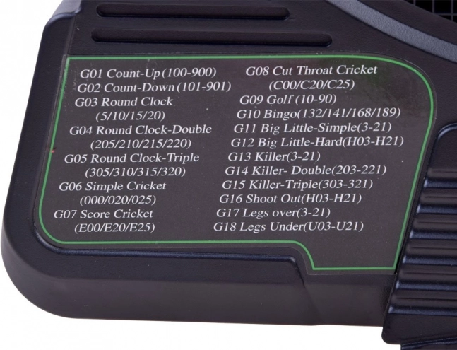 Kies uit 18 ingebouwde spellen en varianten, waaronder populaire modi met de optie DOUBLE IN/OUT. De bediening is intuïtief: GAME voor spelkeuze, OPTION voor instellingen, START/NEXT voor starten en volgende speler.