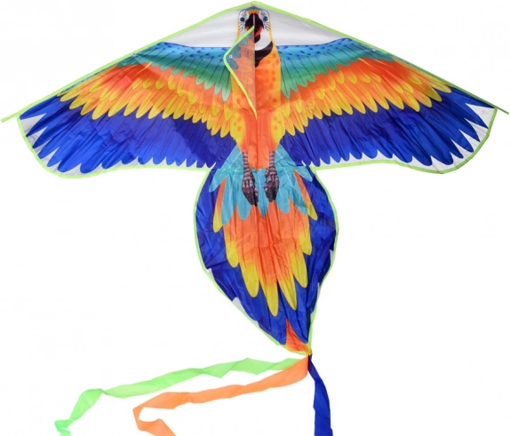 Deze grote vlieger in de vorm van een ara-papegaai is een geweldige keuze voor gezinsuitjes naar het park, het strand of de weide. De lichte constructie stijgt snel op in de wind en de vlucht blijft stabiel dankzij de lange staart met linten, die de balans in de lucht verbetert.