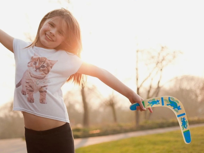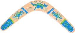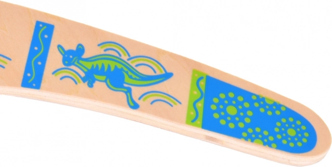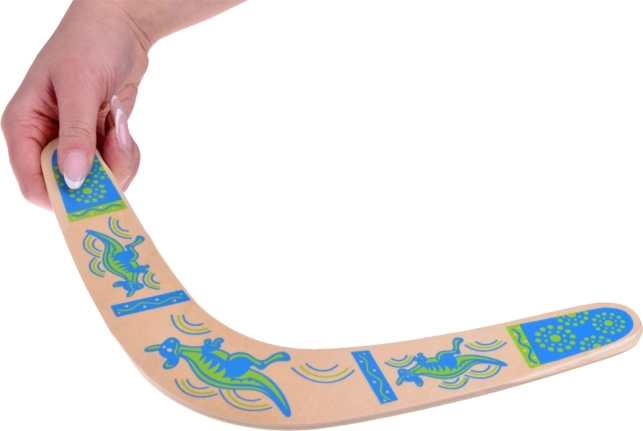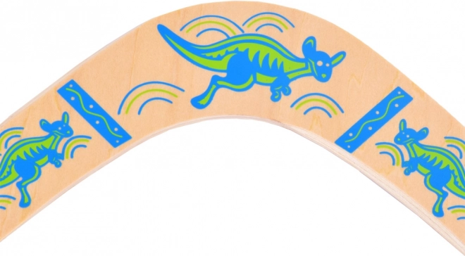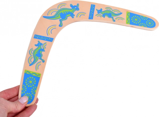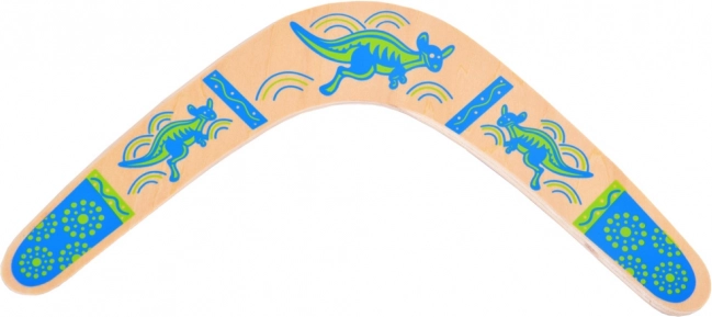 De houten boemerang is geïnspireerd op de Australische traditie en aangepast voor modern recreatief spel. Het uitgebalanceerde profiel en de juiste rotatie maken terugkeer naar de werper mogelijk bij een correcte worp. Kleurrijke prints met kangoeroemotieven geven stijl en verhogen de zichtbaarheid in de lucht.