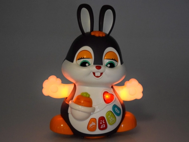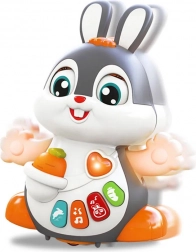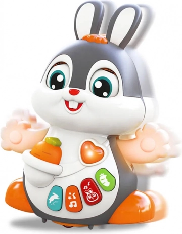 Eigenschappen:- Muziek en licht: Het konijntje danst op de ritmes van vrolijke liedjes en knippert met gekleurde lichtjes, wat de zintuigen van het kind stimuleert en voor extra plezier zorgt.