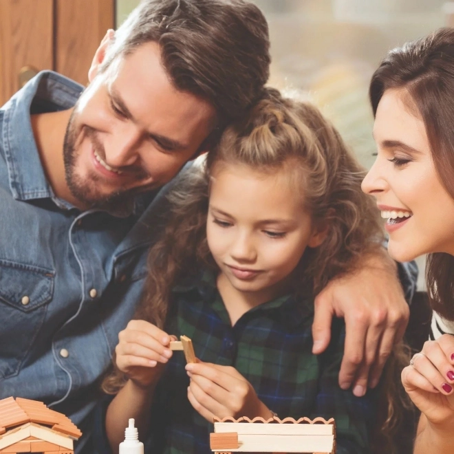 - 385 baksteentjes, houten latjes, decoratieve accessoires, lijm, handleiding