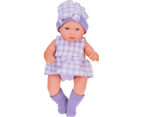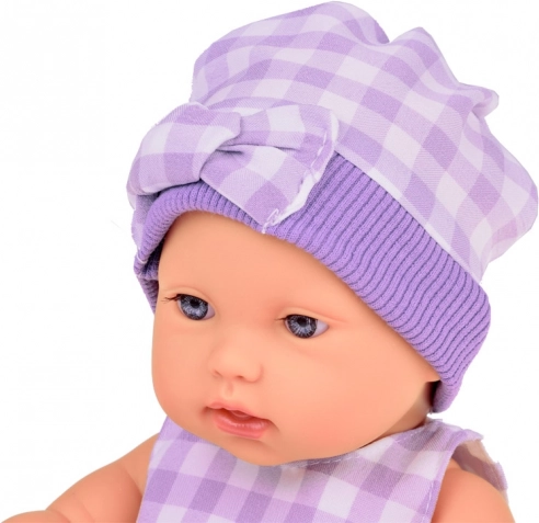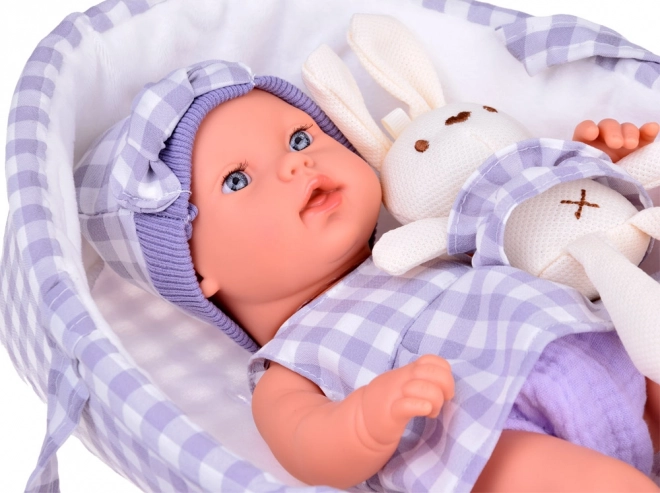 De set is kleurmatig afgestemd in elegant grijs met ruit: de pop draagt een mutsje, jurkje en sokjes; het pluchen konijntje heeft een rokje in dezelfde stijl en de stoffen mand vult het geheel prachtig aan. Dankzij de bewegende ledematen kan de pop gemakkelijk worden neergezet of neergelegd, wat de speelmogelijkheden vergroot.