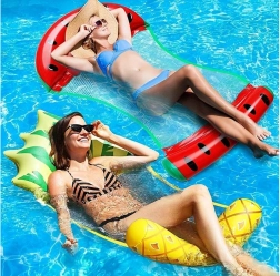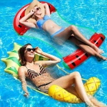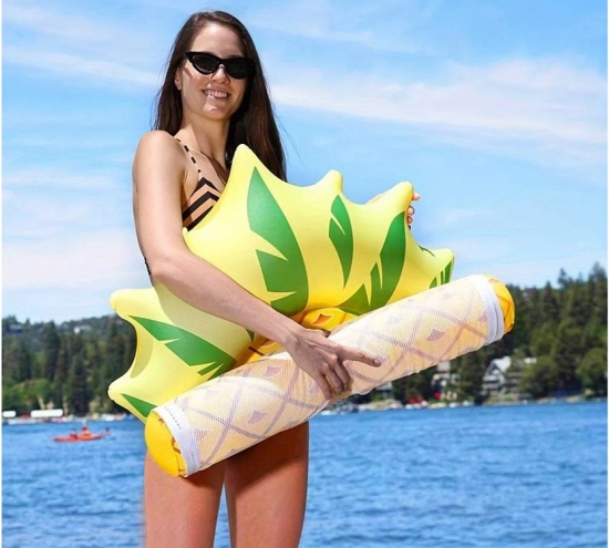 De opblaasbare “pineapple” hangmat combineert een speels design met een slimme constructie: twee luchtcilinders aan de zijkanten voor stabiliteit en daartussen een stevig nylongaas waarop je comfortabel kunt liggen. Je blijft deels ondergedompeld, waardoor je tijdens het zonnen natuurlijk gekoeld blijft.