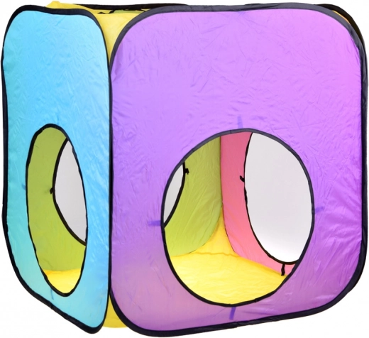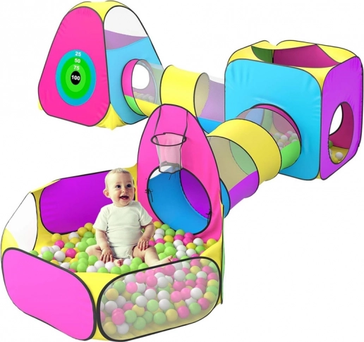 Elke tent biedt andere activiteiten: de driehoekstent met doelschijf en openingen voor werpen met klittenbandballen, de vierkantstent met twee ingangen en de mogelijkheid om tunnels aan te sluiten, en de tent – ballenbak/box ideaal voor een droge ballenbak (ballen niet inbegrepen). Kleurrijke panelen en mesh-delen ondersteunen visuele stimulatie en toezicht door volwassenen.