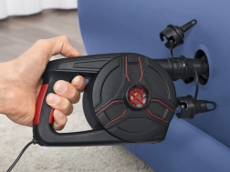 De pomp is uitgerust met universele ventielen en bereikt een luchtstroom van 1100 l/min, waardoor het ideaal is voor verschillende opblaasbare voorwerpen.