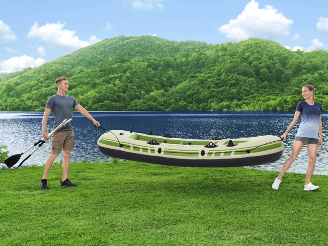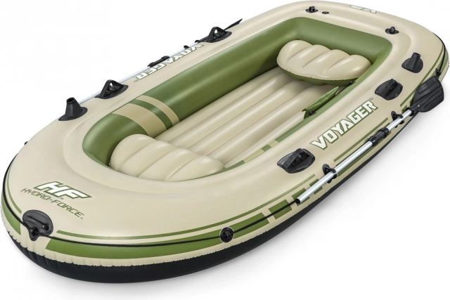 De boot is uitgerust met opblaasbare zitkussens en een opblaasbare bodem, die zorgen voor comfort tijdens uw vaart. Na uw avontuur kunt u deze eenvoudig oprollen en opbergen in de stevige tas. De maximale belasting is tot 360 kg, wat veiligheid voor alle passagiers garandeert.