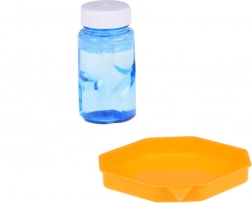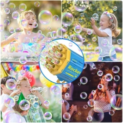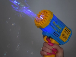 Het bellenblaaspistool is een unieke bubbelmachine omdat het geen ingebouwd reservoir voor vloeistof heeft. Hoe maken we dan deze prachtige regenboogballen die naar de lucht zweven? Het is eenvoudig! Giet gewoon een kleine hoeveelheid vloeistof, die deel uitmaakt van de set, in een ondiep roze schaaltje en doop het voorste deel van het pistool erin. Richt dan en trek de trekker over. Een adembenemend schouwspel ontvouwt zich voor ons! Uit 40 gaten vliegen ronde, glinsterende vormen, wat vreugdevolle uitroepen bij veel kinderen oproept. En volwassenen zijn ook onder de indruk.