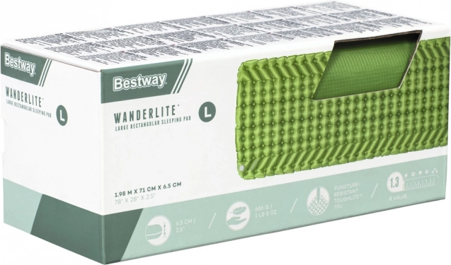 De opblaasbare slaapmat BESTWAY WanderLite Large is een betrouwbare metgezel voor kamperen, trekking en festivals. Dankzij de royale afmetingen van 198 × 71 × 6,5 cm past hij uitstekend bij een grotere slaapzak en biedt hij comfortabele isolatie en ondersteuning op oneffen ondergrond. De combinatie van ToughLite-materiaal en 70D ripstop-nylon zorgt voor hoge bestendigheid tegen slijtage en scheuren bij een laag gewicht.