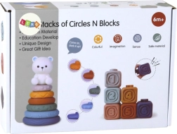 Het middelpunt van de set is een kleurrijke pyramide met een witte beer bovenop, die het kind aanspoort om aan oog-handcoördinatie, bewegingen precisie en logisch denken te werken door het stapelen van ringen in verschillende groottes en structuren.