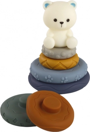 Een kleurrijke pyramide met een witte beer bovenop helpt kinderen bij het oefenen van oog-handcoördinatie en logisch denken.