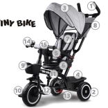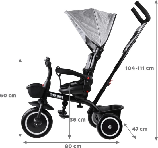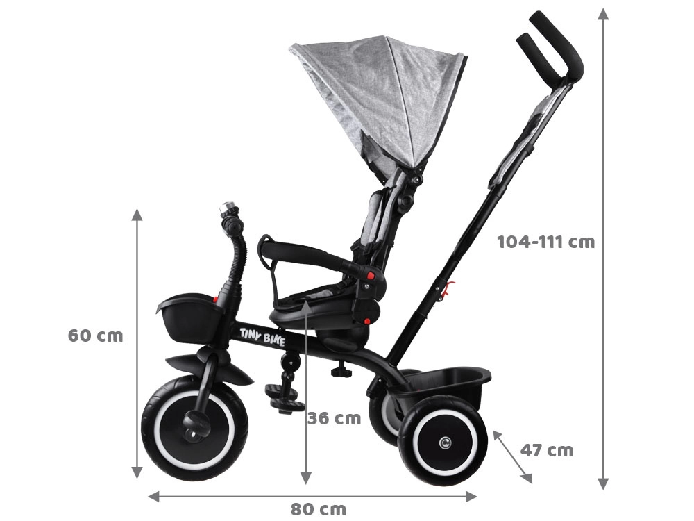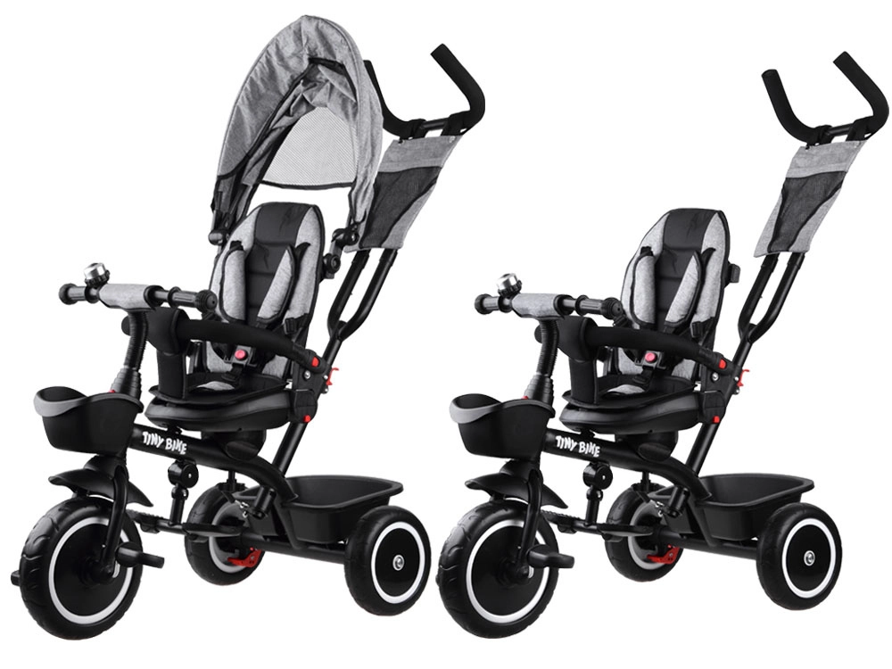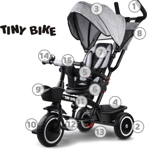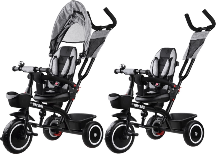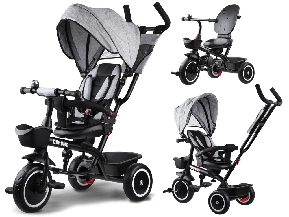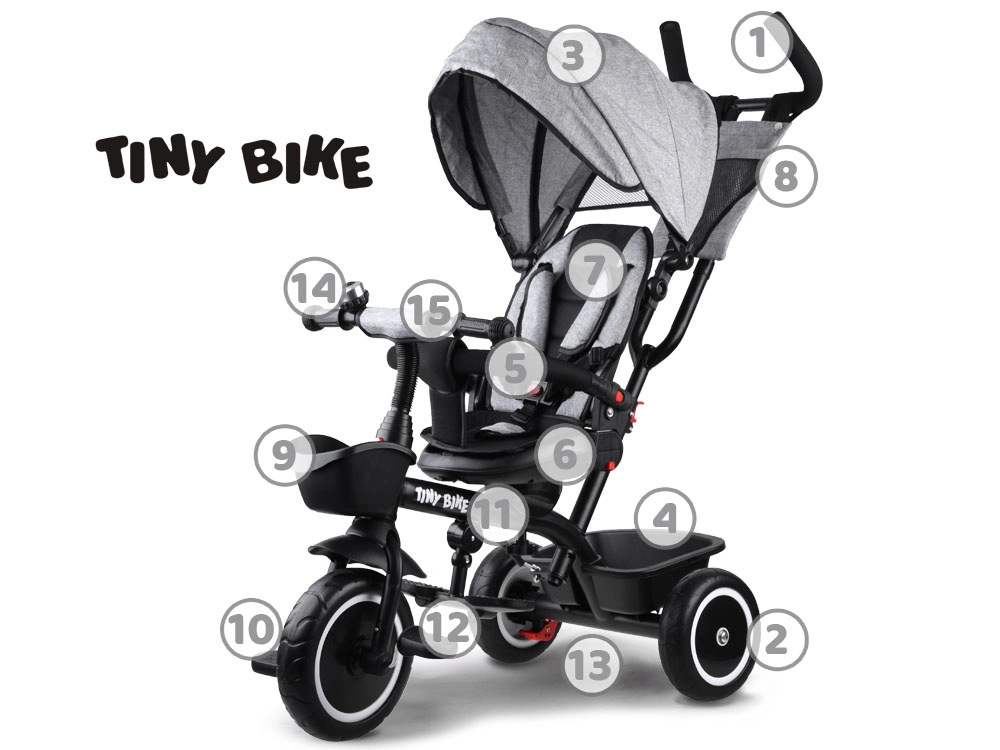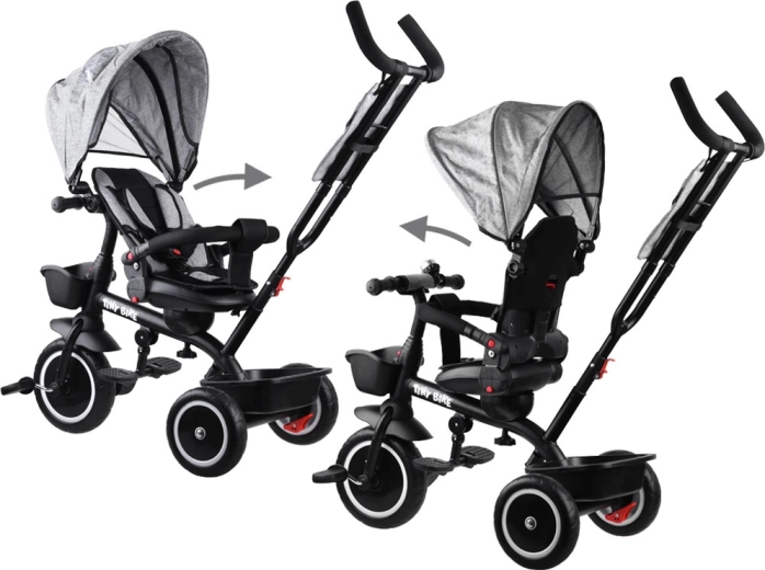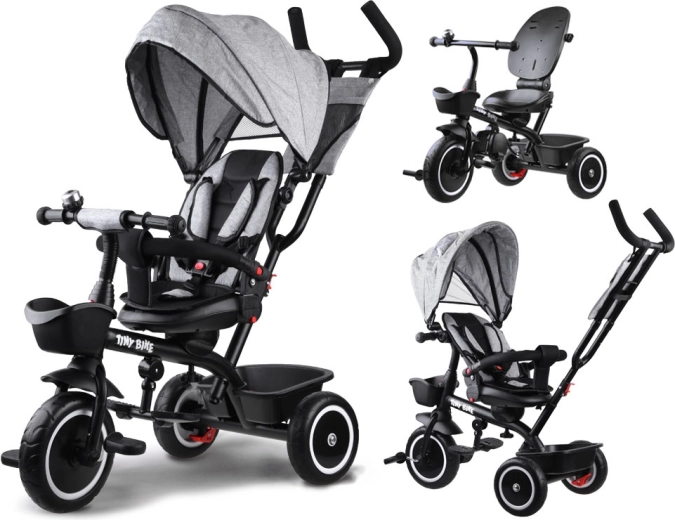 De multifunctionele 3-in-1 kinderdriewieler TINY BIKE met draaibare zitting combineert een duwdriewieler, kinderwagenmodus en een zelfstandige trapdriewieler. Voorzien van een 5-punts gordel, een inklapsbare zonneluifel met gaas, onderhoudsvrije EVA-wielen, achterremmen en veel accessoires voor comfortabele en veilige ritjes van 6 maanden tot ca. 5 jaar.