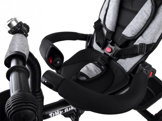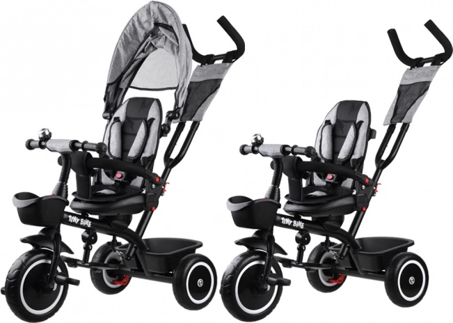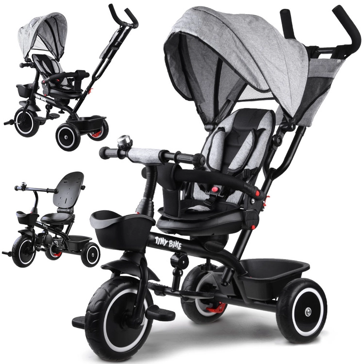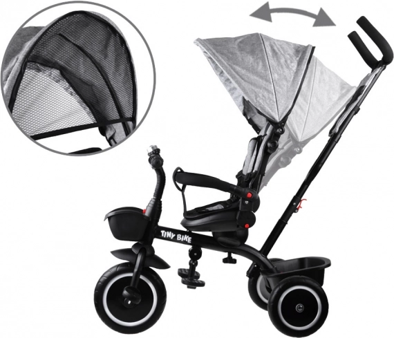 Universele kinderdriewieler 3-in-1 TINY BIKE groeit mee met je kind van 6 maanden tot 5 jaar. Biedt een draaibare zitting, verstelbare rugleuning, 5-puntsgordels, een inklapbare kap met ventilatienet en ouderbesturing met in hoogte verstelbare duwstang. Onderhoudsvrije EVA-wielen, achterremmen en rijke uitrusting zorgen voor veiligheid en comfort bij elke rit.