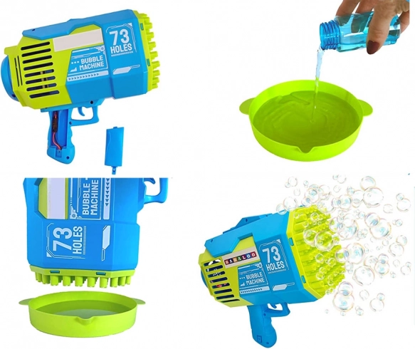 Dit krachtige bubbelpistool tovert elk moment om tot een magische show. Giet de oplossing in het bakje, dompel de kop onder en druk op de knop – tientallen sproeiers creëren tegelijk een stabiele stroom bellen. Ideaal voor verjaardagen, bruiloften, barbecues en spelen in de tuin.