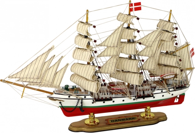 Elegant houten model van het zeilschip DANMARK op een houten sokkel, met oog voor detail en authentieke elementen zoals de Deense vlag, rijk uitgevoerde witte zeilen met contrasterend patroon, een rood‑witte romp met groene streep en reddingsboten en ankers. Ideale decoratie en verzamelobject, perfect als cadeau. CE-certificering, geschikt voor kinderen vanaf 3 jaar.