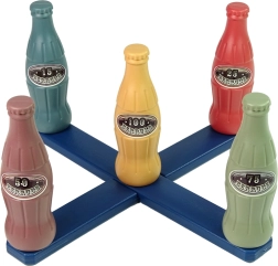 - 2 kunststof dragers (kruisvormige basis), 5 flessen met punten, 5 werpringen