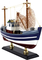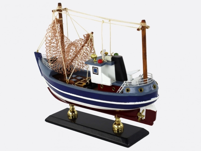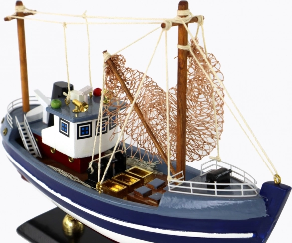 Het model valt op door hoge masten, een gespannen visnet op het dek; de cabine is voorzien van claxons en waarschuwingslichten. Op de boeg bevindt zich een decoratief roer dat herinnert aan de rijke traditie van de zeevaart. Een uitstekende keuze als stijlvolle interieurdecoratie voor de woonkamer, het kantoor of de verzamelplank.
