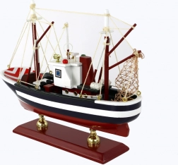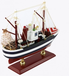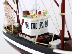 Dit houten verzamelmodel vangt perfect de sfeer van de maritieme wereld. De combinatie van donkerblauw met witte strepen en de opvallende versiering op de boeg creëert een klassieke, authentieke look. Nauwkeurig vervaardigde masten met net en een zorgvuldig uitgewerkte navigatiekajuit benadrukken het vakmanschap.