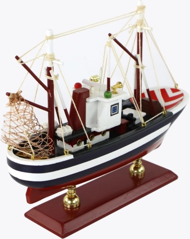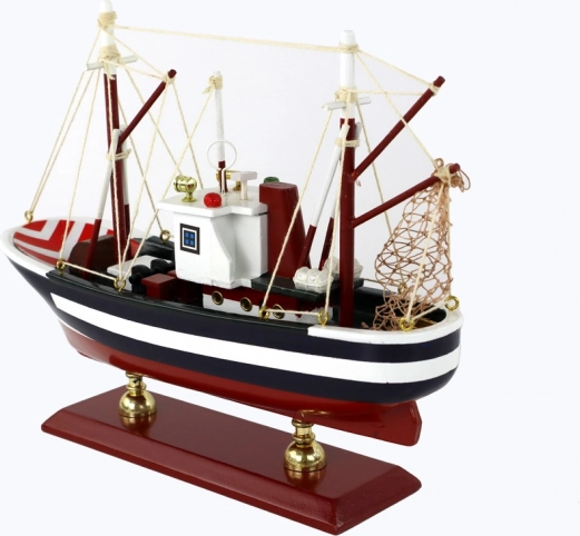 Elegante houten modelviskotter met gedetailleerde hoge masten, een realistisch vissersnet en een kajuit met claxons en waarschuwingslichten. De blauwe uitvoering met witte strepen en het typische wit‑rode boegpatroon oogt tijdloos. Stabiele houten pootjes zorgen voor veilig neerzetten op een plank of tafel. Ideaal als cadeaudecoratie voor zeeliefhebbers en verzamelaars.