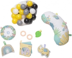 De educatieve mat wordt geleverd met speeltjes die aan de boog kunnen worden gehangen of afzonderlijk gebruikt kunnen worden. Inbegrepen zijn: een spiegeltje, een bijtring en een knisperend boekje. De set bevat ook een kussentje in croissantvorm dat je kindje helpt bij de eerste pogingen tot kruipen.