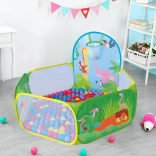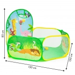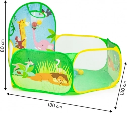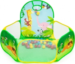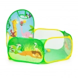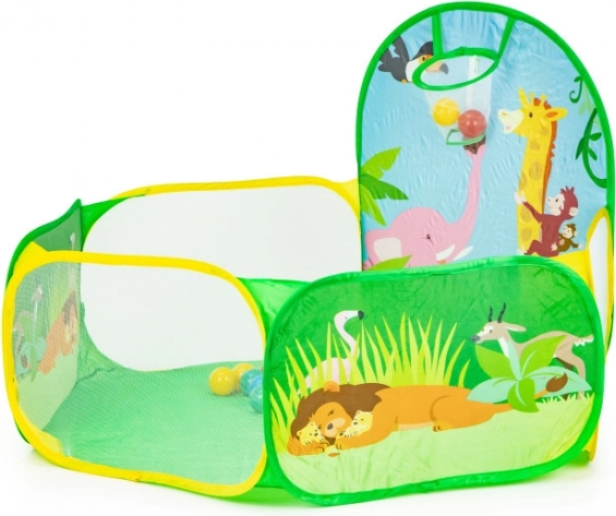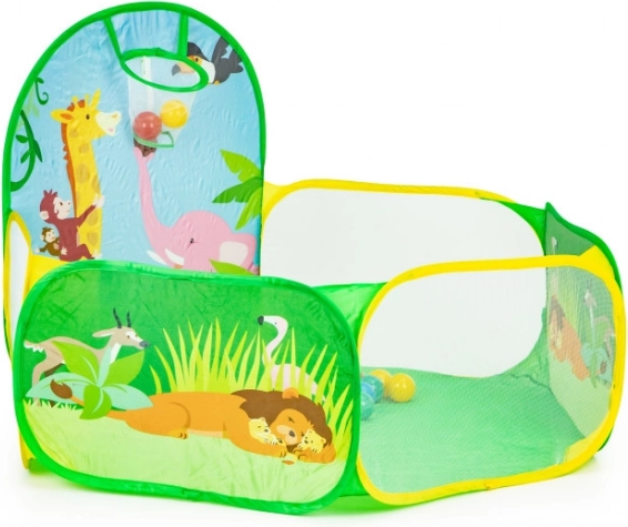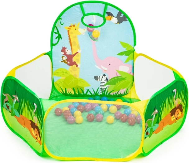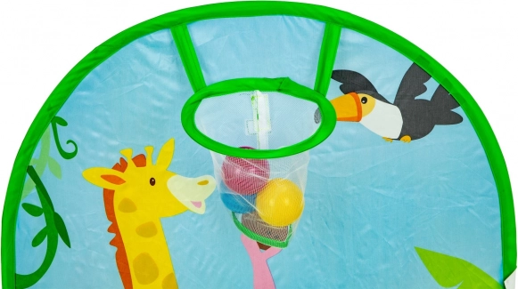De set bevat 50 plastic ballen (Ø 6 cm) die de tent omtoveren tot een leuke droge ballenbak. De ingebouwde werpkorf stimuleert beweging, ontwikkelt coördinatie en precisie. De duurzame bodem is klaar voor spel binnenshuis en buitenshuis.