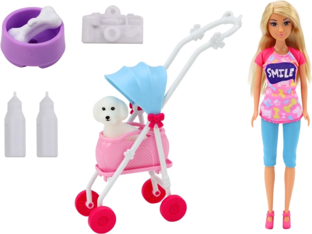 Het stijlvolle wagentje in pastelkleuren is niet alleen een comfortabele plek voor het hondje, maar wordt ook aangevuld met accessoires zoals een camera, flesjes, een bot en een bakje, wat kinderen aanmoedigt om de meest uiteenlopende verhalen te bedenken.