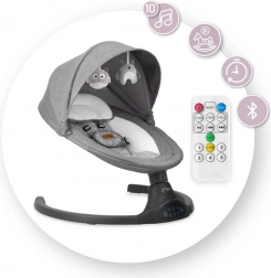 De bediening is eenvoudig en intuïtief: kies een van de 5 schommelniveaus, stel de timer (8/15/30 min) in en selecteer 10 kalmerende melodieën of speel muziek af via Bluetooth. De stille motor verstoort de slaap niet en met de afstandsbediening kun je instellingen wijzigen vanaf de bank.