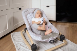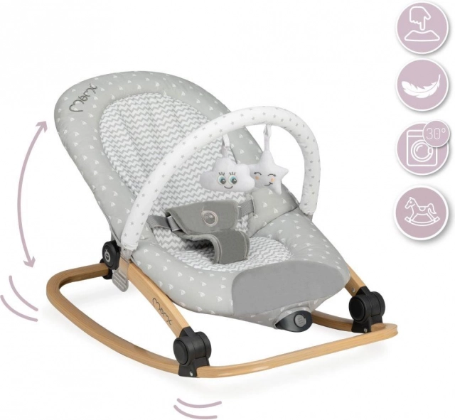 De MoMi Lumiwood ligstoel biedt de ideale omgeving voor ontspanning van uw kind. Dankzij de driepunts veiligheidsgordel en speciale kruisriem is uw kind altijd veilig. De ligstoel is voorzien van een sensorische unit die melodieën en vibraties genereert.